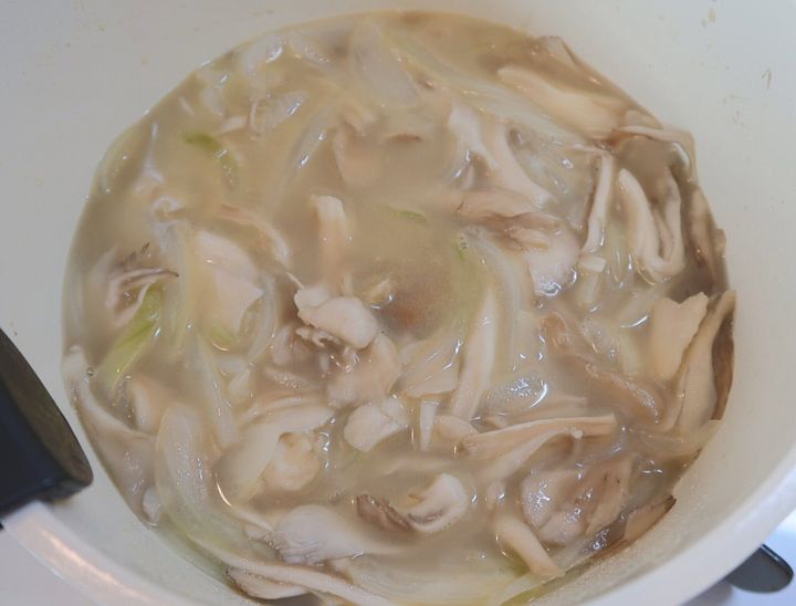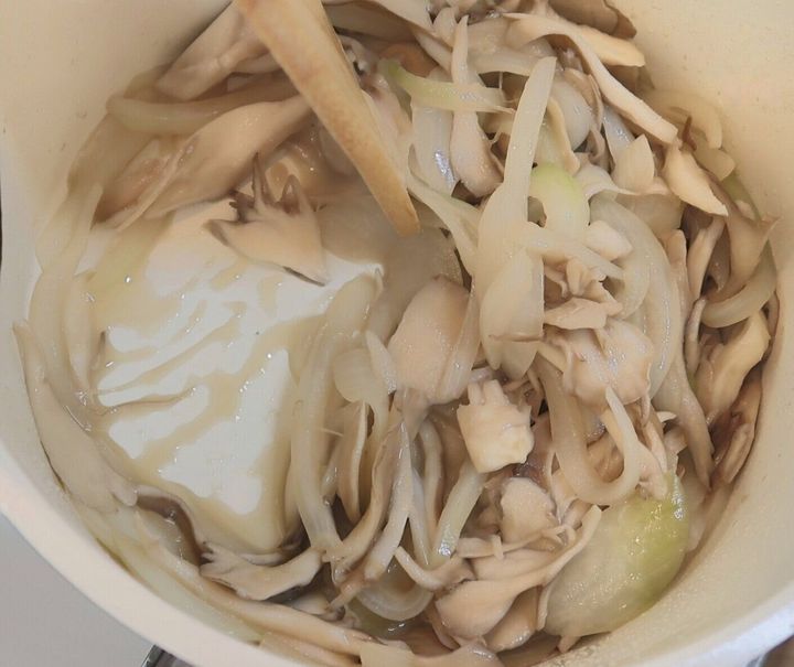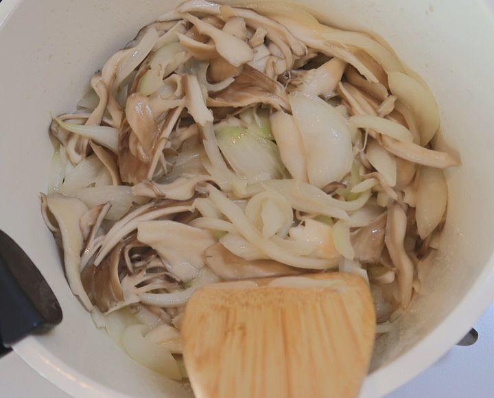 玉ねぎが透き通りしんなりしたら、舞茸を加えて中火で約3分炒めます。