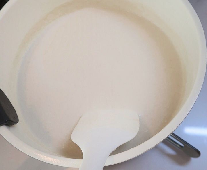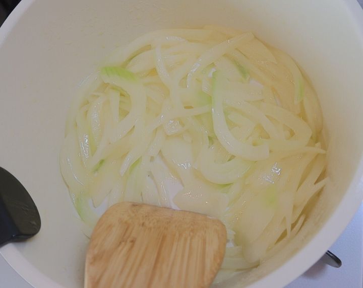 鍋にバターを中火で熱し、玉ねぎを約3分炒めます。ここでひとつまみの塩(分量外)を加えると焦げつきを防ぐことができます!