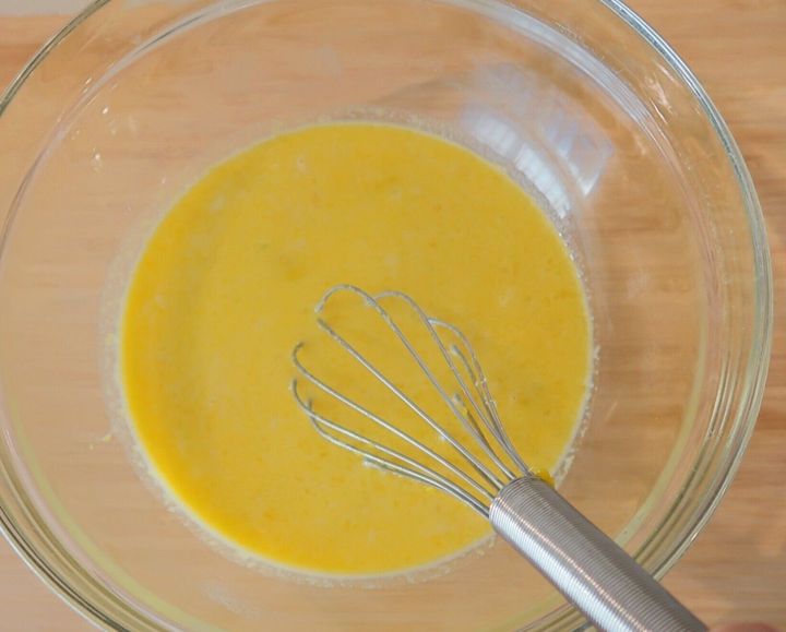 大きめのボウルに卵を割り、よく溶きほぐします。つづいて砂糖、牛乳、つぶしたかぼちゃ、溶かしバターを順に加え、そのつど泡だて器で全体が均一になるまでよく混ぜ合わせます。