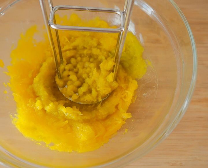 かぼちゃのあら熱が取れたら、大きめのスプーンで果肉をくり抜きボウルに入れます。つづいてマッシャー(または大きめのフォーク)で果肉をつぶし、なめらかにします。