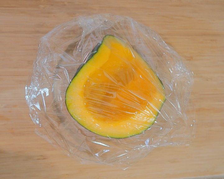かぼちゃは洗って種とワタを取り除き、耐熱皿にのせてふんわりとラップをかけて、電子レンジ(600w)で約6分加熱します。
