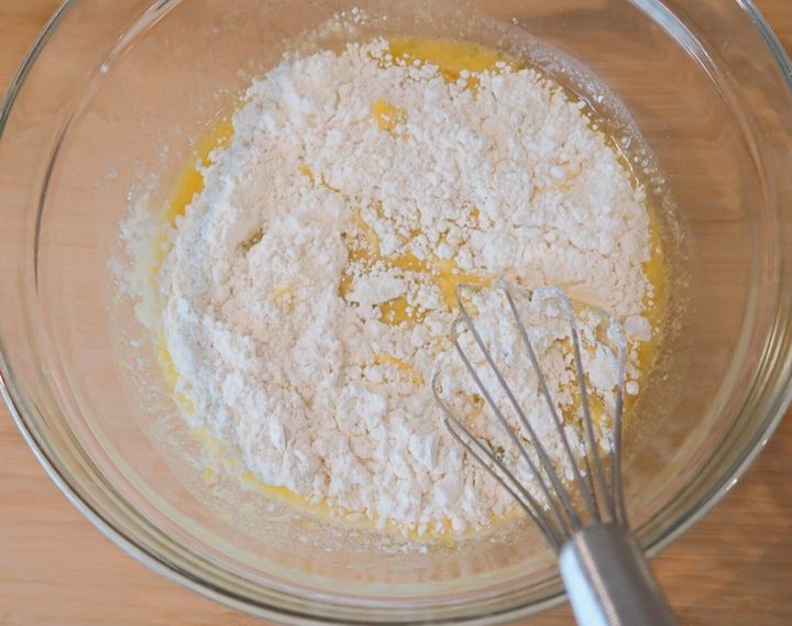 最後にホットケーキミックスを一度に加え、粉けがなくなるまで全体を混ぜ合わせます。