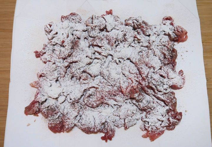 牛肉は必要に応じて食べやすい大きさに切り、塩、こしょうで下味をつけます。つづいて薄力粉(小さじ2)を肉全体にふるい、うすくまぶしつけます。