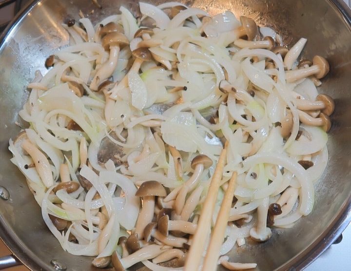 大きめのフライパンにバター(25g)を中火で熱し、玉ねぎ、しめじを加えて約5分炒めます。じっくり炒めることで素材の旨味を引き出します!