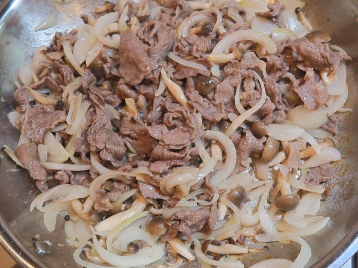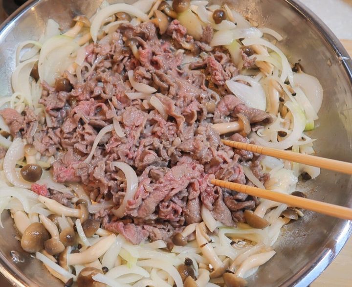 つづいて炒めた玉ねぎとしめじをまわりに寄せ、真ん中の空いたスペースに(1)の牛肉を入れて中火で炒めます。