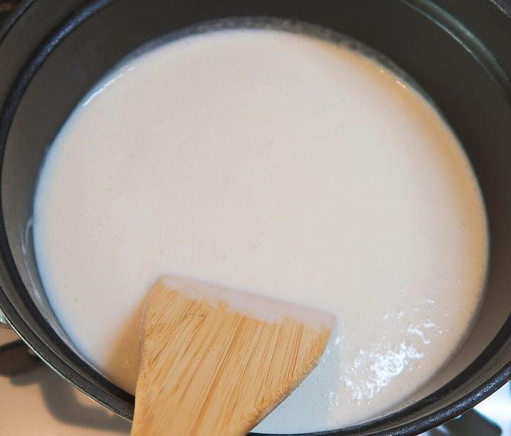 粗熱をとり、牛乳(150ml)とともにミキサーにかけて鍋に戻します。