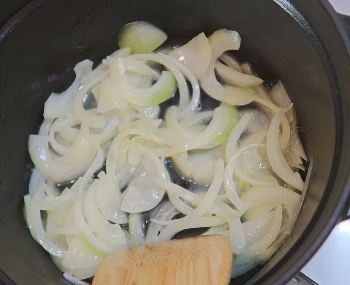 鍋にバターを中火で熱し、玉ねぎを約3分炒めます。ここでひとつまみの塩(分量外)を加えると焦げつきを防ぐことができます!