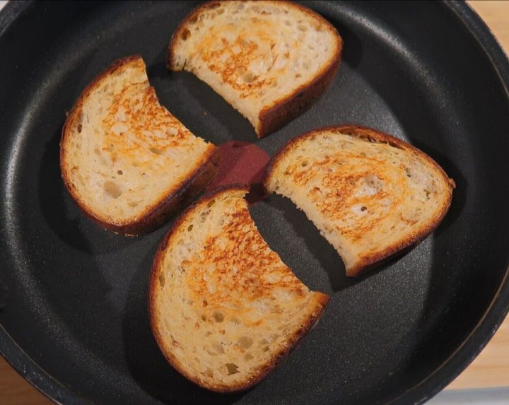 バター(またはオリーブオイル)を熱したフライパンで、パンを焼きます。