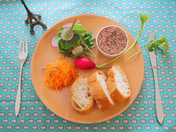 完成したキャロットラぺとレバーパテを、お好みのサラダやバゲット(またはお好みのパン)と一緒に、お気に入りのプレートに盛りつけます。