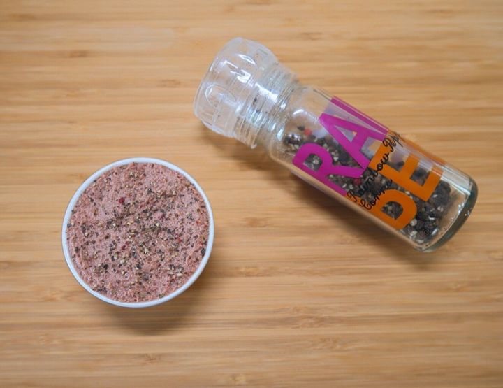 今回は、わが家で愛用している カルディの「レインボーペッパー」を使用しました。ピンク・ホワイト・グリーン・ブラックの4種類のペッパーがミックスされているので、香りと彩りのアクセントになりとってもオススメです。