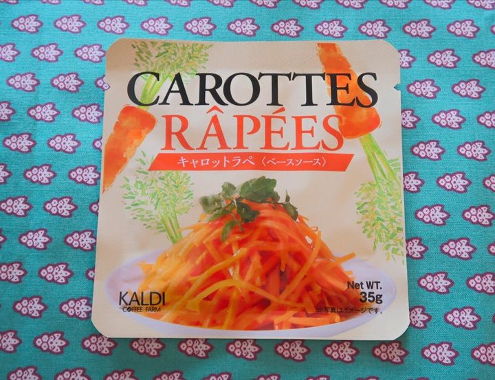 まずはこちら。フランス家庭料理の定番キャロットラぺがあっという間につくれちゃう、カルディオリジナルのベースソースです。オレンジ果汁とレモン果汁が入っているので、さわやかなオレンジの風味が広がります!