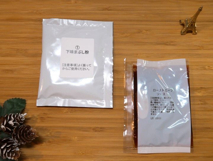 中にはローストビーフをおいしくつくれるシーズニングと、旨味たっぷりのソースが入っています。お肉さえあればいつでも気軽に自家製ローストビーフをつくることができちゃいます!