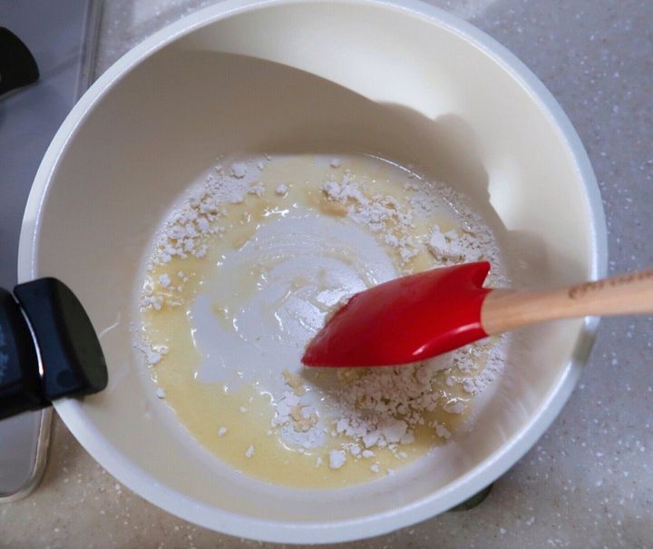 小さめの鍋を中火にかけ、バター10gを溶かします。バターが溶けたところで鍋を一度火からおろします。小麦粉を一度に加え、ヘラで粉気がなくなるまでよく混ぜ合わせます。