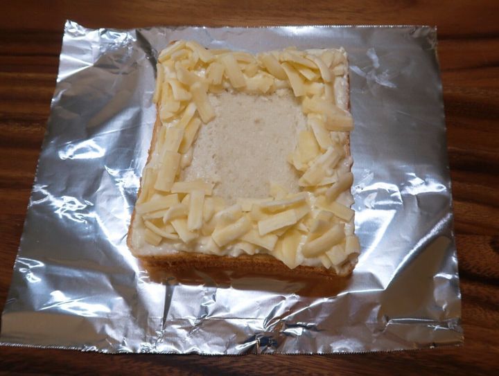 食パンをアルミホイルにのせます。(1)のベシャメルソースを、食パンのフチにのせます。