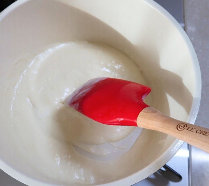 牛乳を約1/3量加えよく混ぜます。全体が均一になったら残りの牛乳を少しずつ加え、その都度なめらかになるまでよく混ぜ合わせます。
