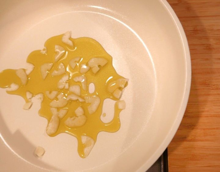 フライパンにオリーブオイルとにんにくを入れ弱火にかけます。