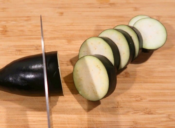 ナスはヘタをとり1cm幅の輪切りにします。