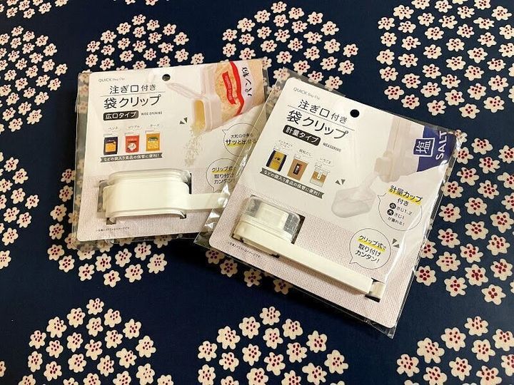 100円ショップセリアで見つけた『注ぎ口付き袋クリップ』広口タイプと計量タイプの2種類ありました。