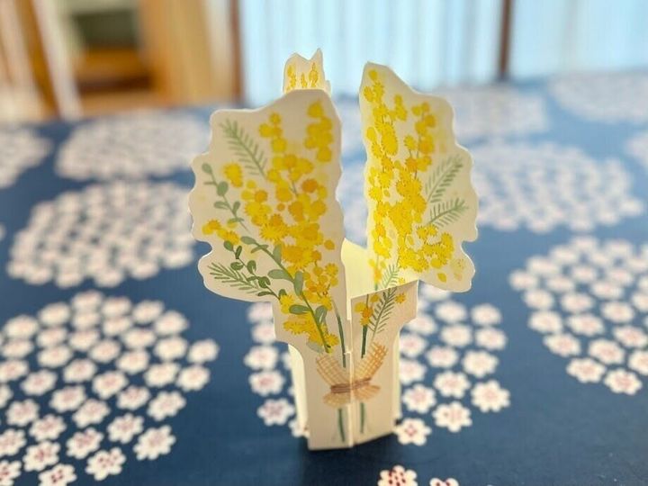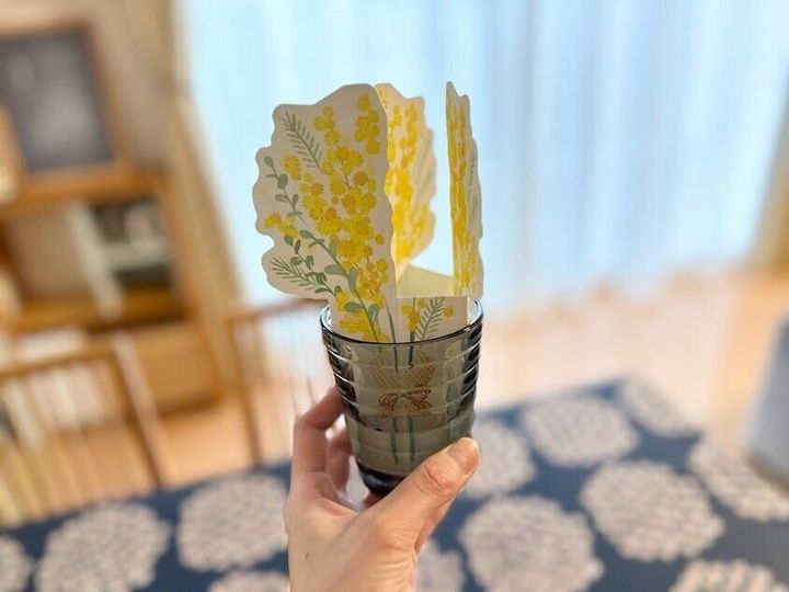 ペーパーを折り曲げて切り込み部分に突起部分を差し込むと自立してくれるようになっています。水道水を入れたお気に入りのグラスやカップに入れて、好きな場所に置くだけで気軽に加湿をプラスすることができます。可愛いミモザのイラストが、置くだけで華やかになり、さりげなくインテリアにもなってくれますよ。