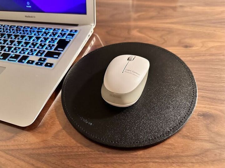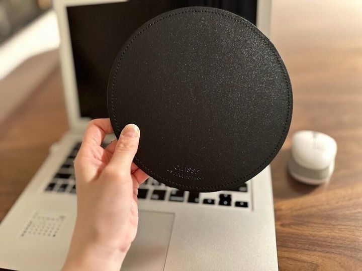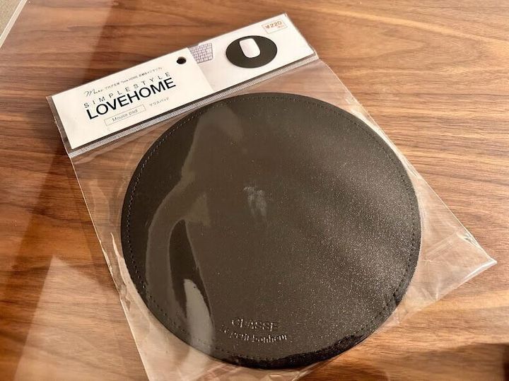 かなりしっかりとした材質のフェイクレザー。丸いフォルムにロゴがすごくおしゃれなんです。220円で購入できることにちょっとびっくりしました。値段を言われないと分からない高見えするマウスパッドですよ。インテリアマットとしても使えそうです!