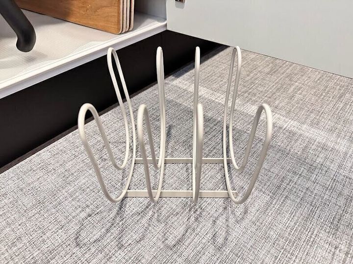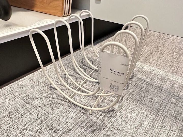 トレーのなだれ防止に3COINSの『鍋フタスタンド』が大活躍してくれます!価格は330円(税込)です。