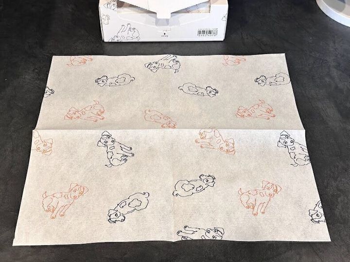 サイズは1枚あたり約30×35cm。材質はポリエステル、レーヨンで可愛い犬柄になっていますよ。