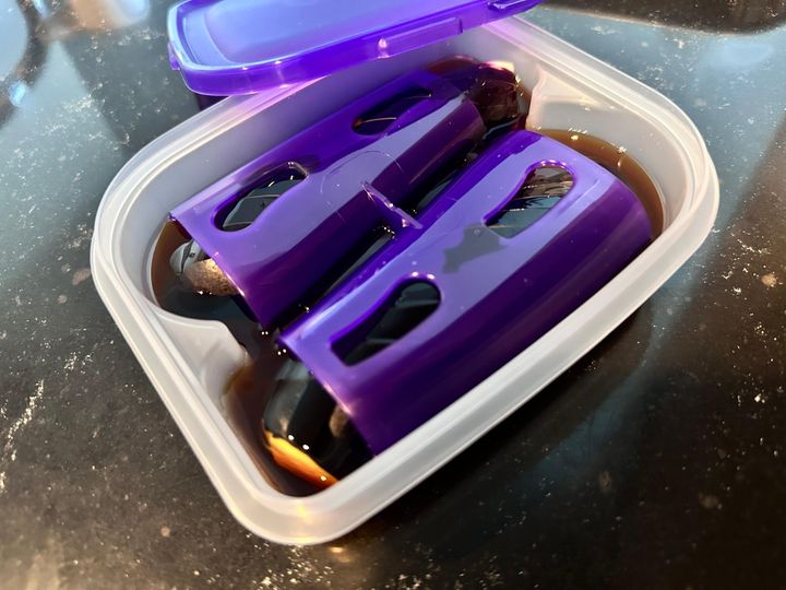 2.容器の底から4分の1〜3分の1ほどの高さまでめんつゆを入れてます。(お好みですりおろししょうがを入れてもOK!)