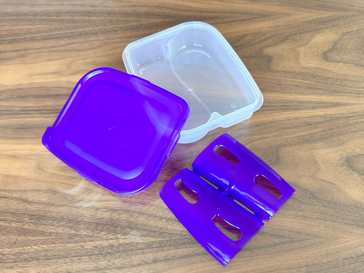 本体と落とし蓋と外蓋のセットになっていて、材質はポリプロピレン。サイズは約W143mm×D120mm×H37mmです。耐冷耐熱温度は-20℃〜140℃になっています。嬉しい日本製です。食洗機・オーブン・直火は不可です。