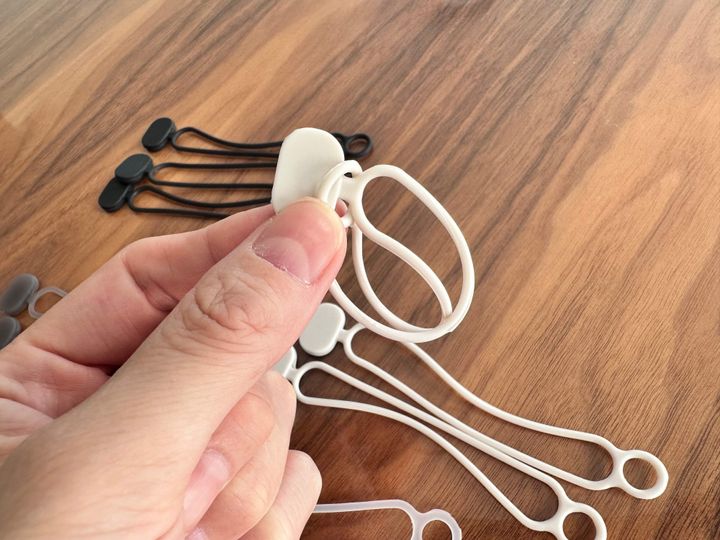 使い方はすごく簡単で、バンドをくるっと回して、丸い先端を広げた留め穴に入れて使うようになっていますよ。輪ゴムとは全然違っていてやわらかいので、小さなお子さんでも使いやすいと思います。このシンプルでオシャレな見た目が無印良品らしいです。