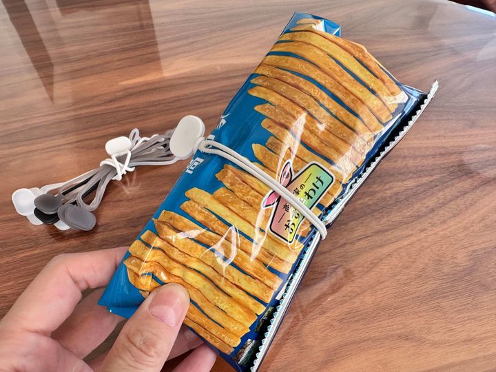 このマルチバンド、開封したお菓子の袋止めにすごく便利なんです。シリコーン素材なので、伸びがよく軽い力でとめることができます。しかも、耐熱温度150℃、耐冷温度-20℃なので湯せんすることも可能なんです。冷凍庫に入れることもできますよ。チャーハンなどのあまった冷凍食品を輪ゴムやプラスチックでできたクリップで留めていると、どうしても劣化して、切れたり割れてしまったりするんですよね。でも、これならそんな問題なし!