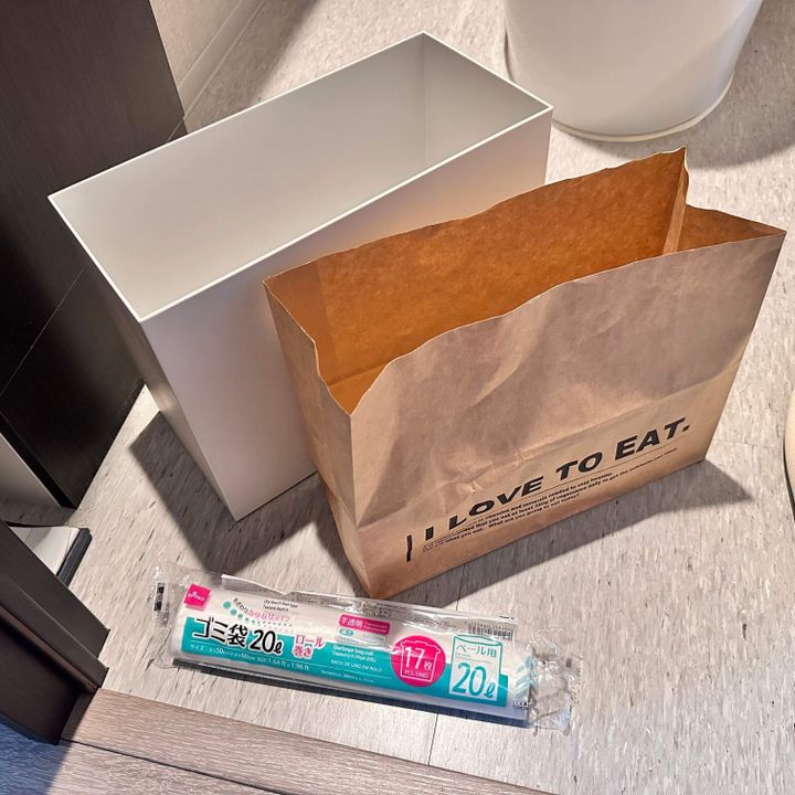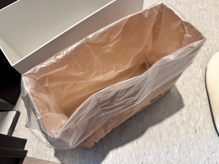 無印良品のファイルボックスのサイズが約幅15×奥行32×高さ24cmに対して、セリアのガゼットバッグLLサイズは幅12×奥行30×高さ25cmなので、ファイルボックスの中にすっぽり入ります。(高さは1cm出てしまうので、折り曲げるか、ハサミでカットしてくださいね。)あとはゴミ袋をセットするだけ!ロール巻きタイプのゴミ袋だと、ゴミがいっぱいになったら、袋を持ち上げてミシン目に沿って切り取ることができ、すぐに新しいゴミ袋をセットすることができるので便利ですよ。