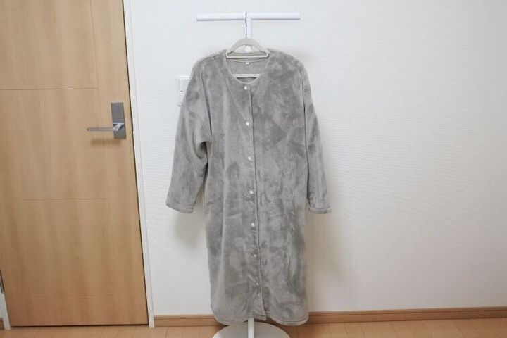 毛布に包まれているようなあたたかさです。フードもなく襟ぐりがスッキリしていてスナップボタンで前をとめることができるので、このまま布団に入るこもできて便利です。
