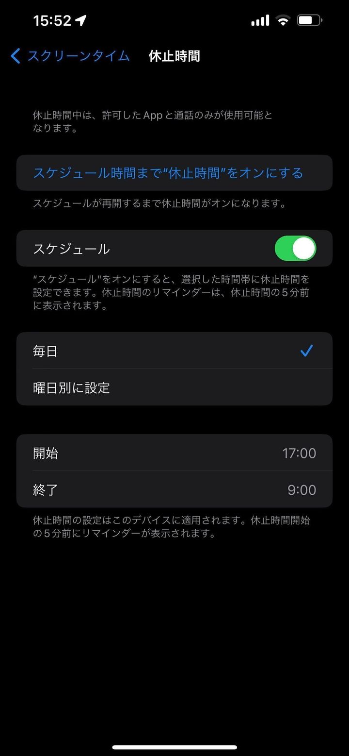 写真のように「スケジュール時間まで休止時間をオンにする」設定にして、