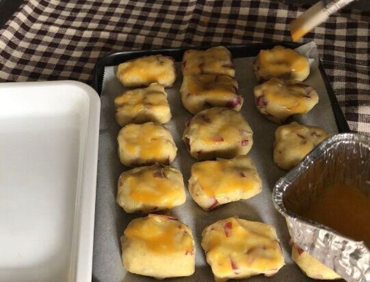 ひとくちサイズに切り分けて成型し、焼きトレーに並べていきます。