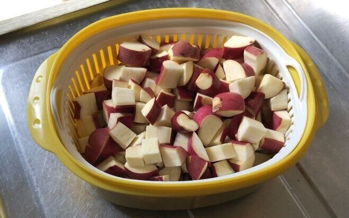 さつまいも大2本(約500g)は皮をむき、2cm角に切り水にさらし水気をきります。そのそも芋類にアクはないのですが、水にさらすのは表面に出る栄養成分のポリフェノールが空気に触れて酸化し茶色系になるのを防ぐためです。今回は5分ほど水にさらしました。