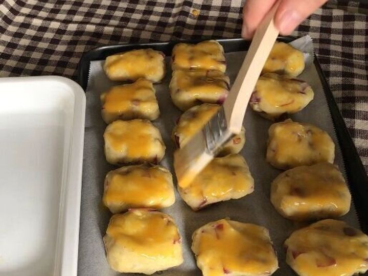 トースターで焼き色がつくまで5分程度焼きます。表面をツヤツヤにしたいときは、焼き色用の卵黄を重ね塗りしてください。ツヤはなくなりますが卵黄は塗らなくても大丈夫です。