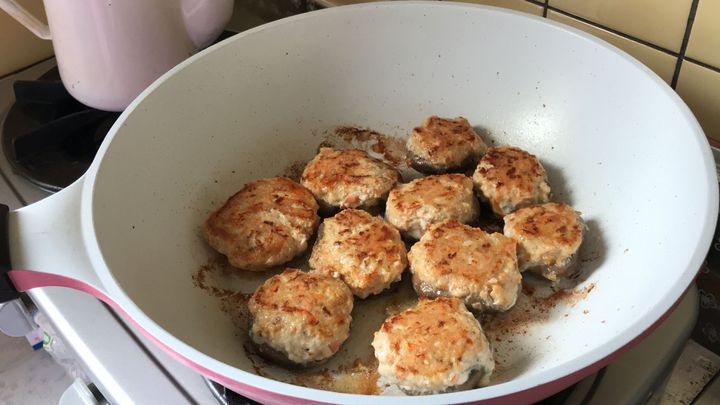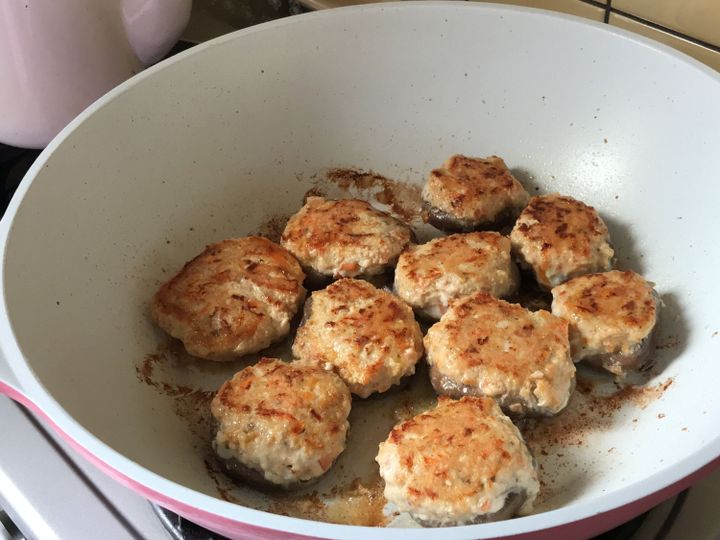 肉だねを8等分にして丸めてシイタケの上にのせ、肉の面を下にしてフライパンで焼きます。