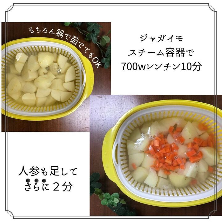 スチーム容器を使って電子レンジで蒸します。ジャガイモを700Wで10分加熱したのち、人参を加えてさらに2分蒸します。もちろん鍋で煮ても構いません。