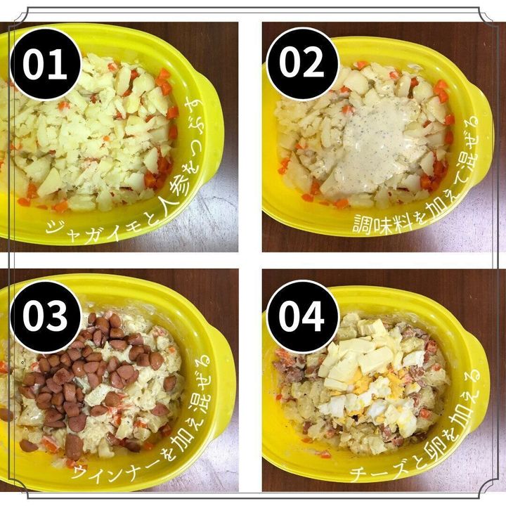ジャガイモと人参をつぶした所に、合わせた調味料を入れてよく混ぜます。その後ウインナーを加えてさらに混ぜます。粗熱が取れたら、最後にチーズとゆで卵を加えます。