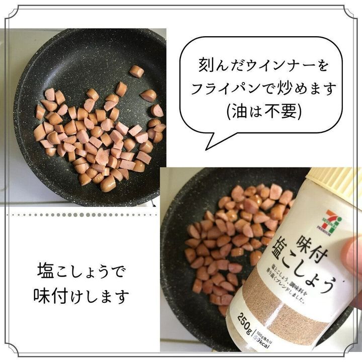 刻んだウインナーをフライパンで炒めます。この時油はひかなくてもOKです。火が通ったら塩こしょうで味付けします。