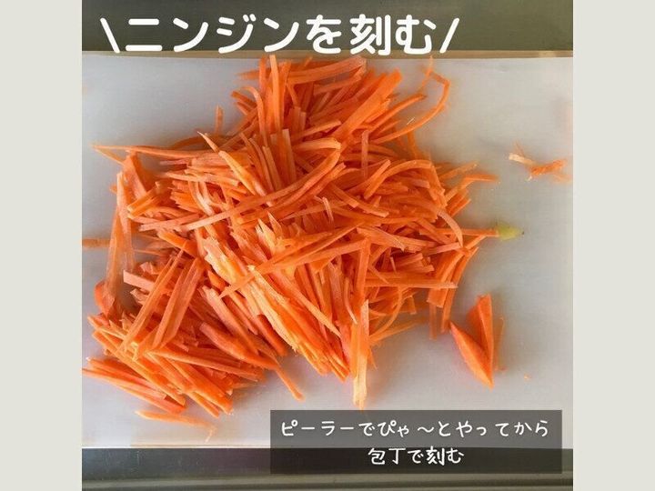 にんじんをピーラーで細く引いてから、3~4センチほどの長さに切り揃えます。細く切りすぎないほうがシャキシャキした食感を楽しめます。