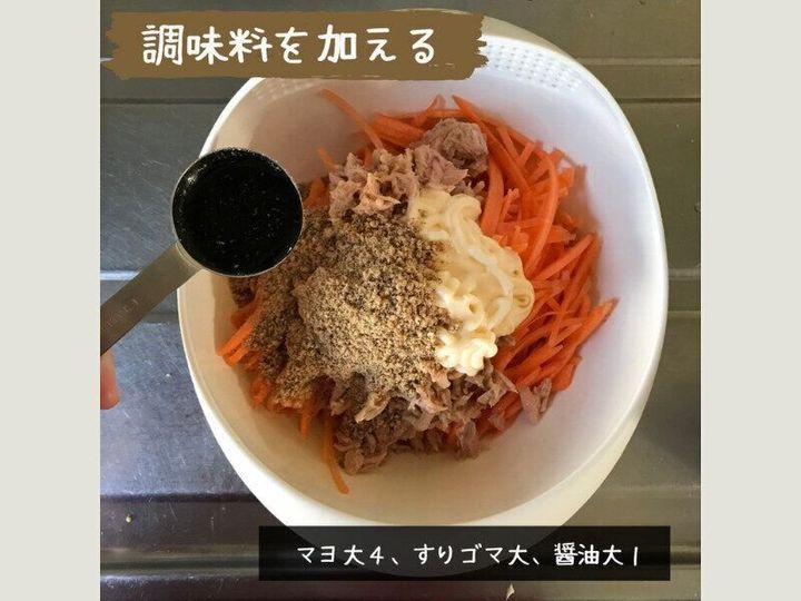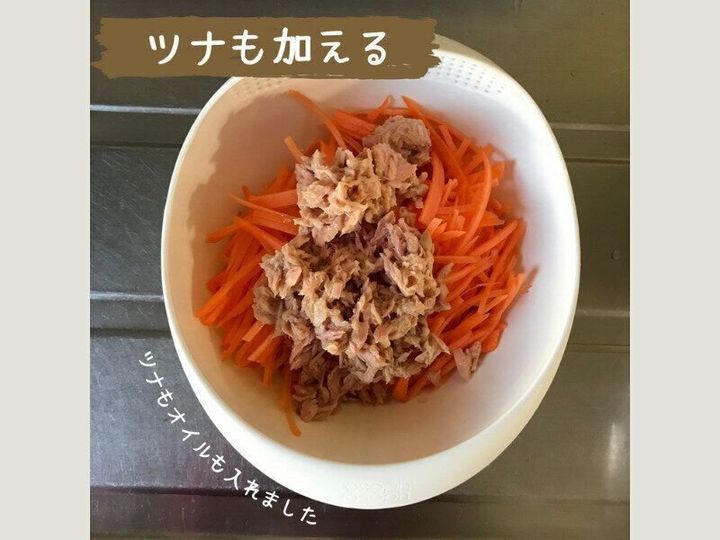 ボウルにカットしたにんじんと、ツナ缶を入れます。ツナ缶はオイルごと使っていますがお好みで。