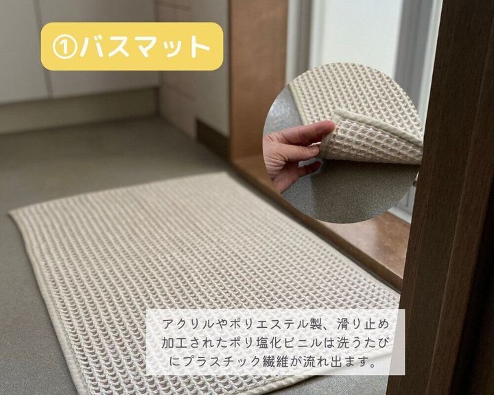 アクリルやポリエステル製、滑り止め加工されたポリ塩化ビニルは洗うたびにプラスチック繊維が流れ出ます。