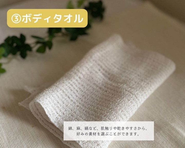 合成繊維には泡立ちの良さ、乾きの早さなど機能的な面もありますが、身体を洗うためのボディータオルは、ポリエステルやナイロン製が目立ち、劣化とともにプラスチック繊維が抜け落ちていきます。