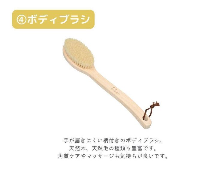 手が届きにくい場所を洗うのに便利な柄付きのボディブラシ。天然木、天然毛の種類も豊富です。