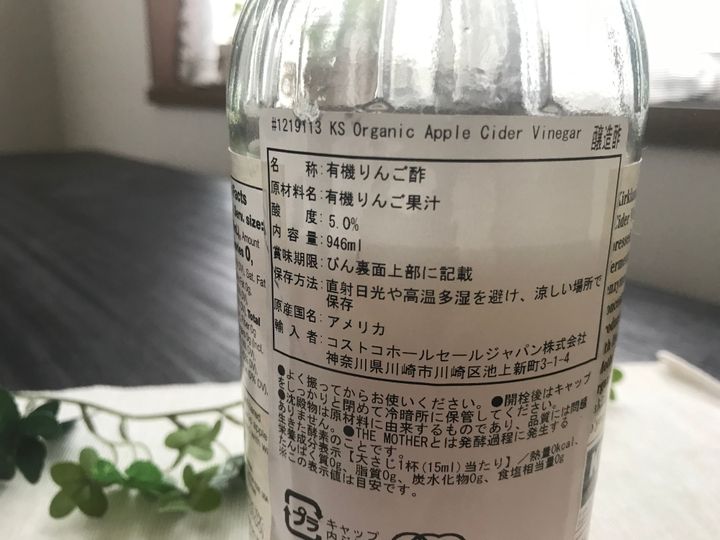 コストコの有機りんご酢。946ml、酸度5.0%。保存方法は直射日光を避けて涼しい場所で保存。購入したときは、3本セットで約1000円でした。既に1本空けていて、これが2本目です。