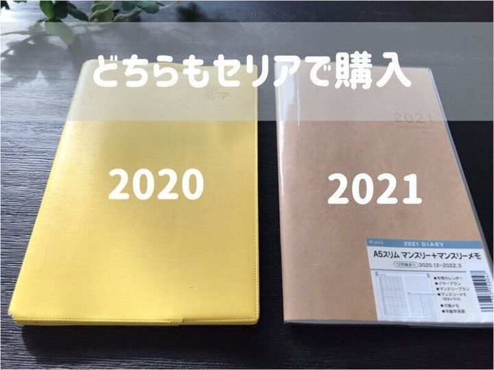右側の少しスリムなほうが2021年版に選んだ手帳。無印っぽいデザインですが間違いなくセリアの手帳です。