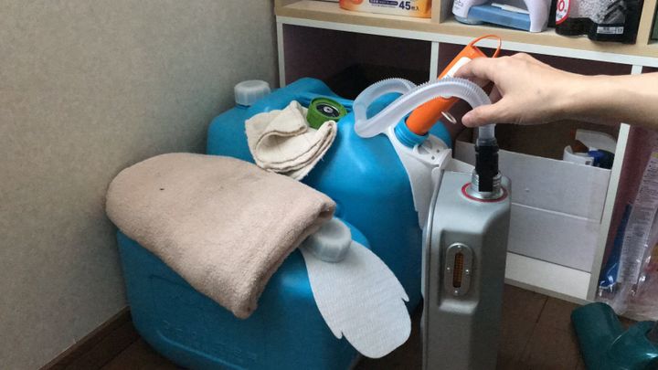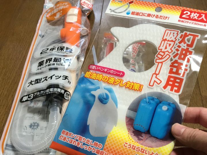 灯油ストーブの関連グッズも購入しました。電動式の灯油ポンプストッカーも1個100円+税で購入することができました。灯油ポリタンクのキャップを外し、ストッカーを取り付けるだけで、スマートに灯油グッズを収納できます。