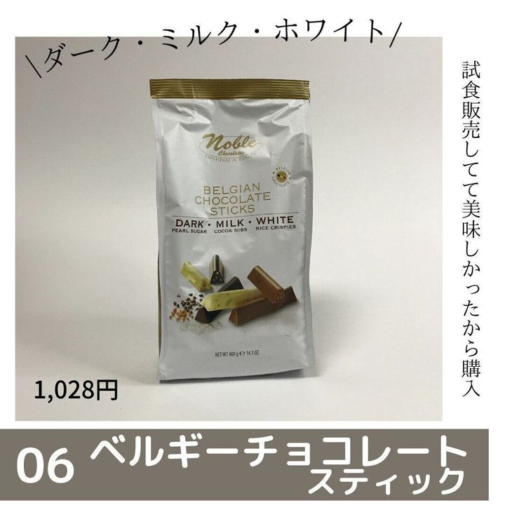 ベルギー産のチョコレートで、ダーク、ミルク、ホワイトの3種類入り。苦めチョコは入っていないので甘いチョコが好きな人におすすめです。