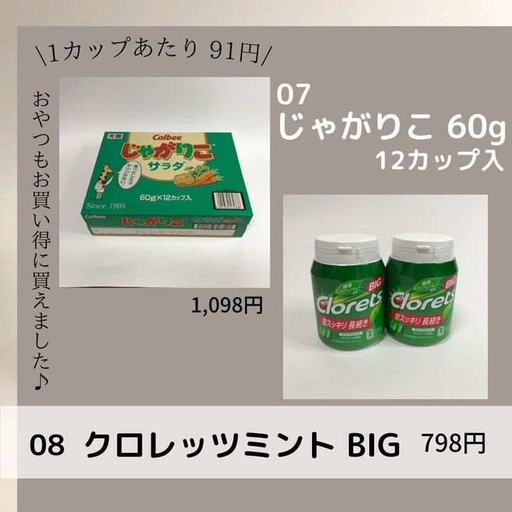 じゃがりこを1ダース購入。1カップあたり91円でした。ちょっと小腹が好いたときに食べられるじゃがりこは私も夫も大好きです。